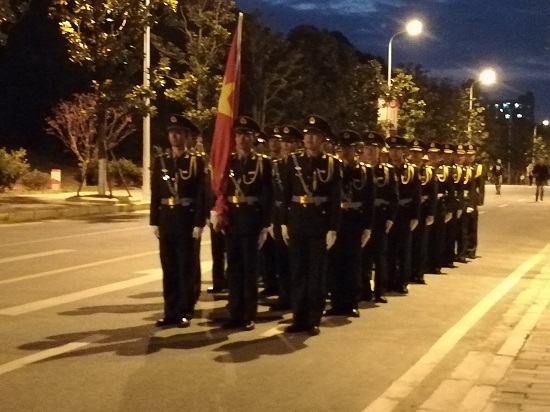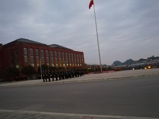 6:40國(guó)旗護(hù)衛(wèi)隊(duì)整隊(duì)完畢,護(hù)送五星紅旗入場(chǎng)。7:00,隨著“奏中華人民共和國(guó)國(guó)歌,升中華人民共和國(guó)國(guó)旗”的口令,旗手出旗、升旗,五星紅旗在空中迎風(fēng)飄揚(yáng)。全體師生行注目禮,奏唱國(guó)歌,表達(dá)對(duì)祖國(guó)的崇高敬意。