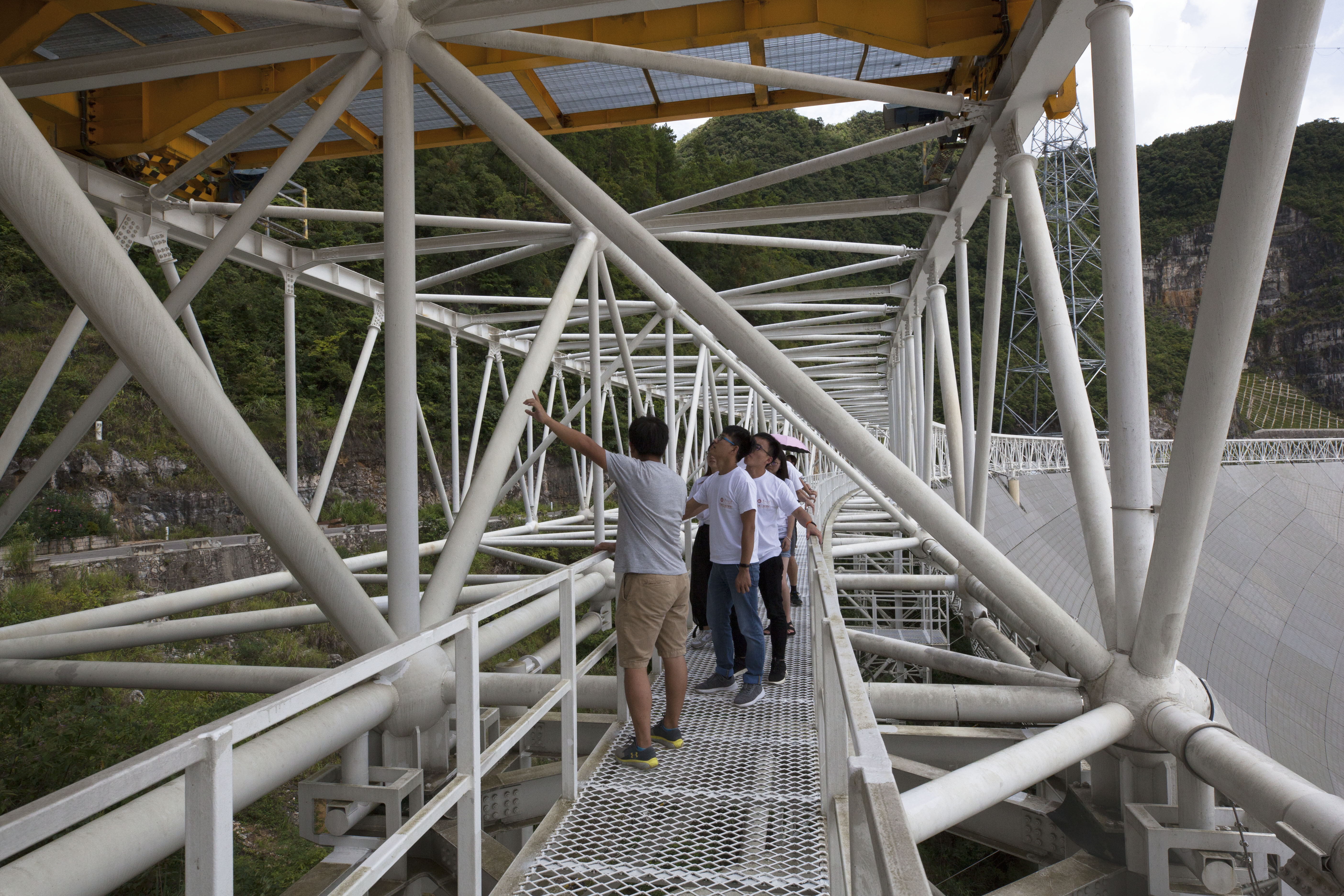 實踐隊到達天文臺辦理完入住手續(xù)后,便迅速進入了實踐工作狀態(tài)。首先FAST負責人以短片的形式向大家介紹了FAST及其建造過程,隨后在岳昊老師的帶領下參觀了FAST工程現(xiàn)場,并且有相關負責人在現(xiàn)場解答了同學們的疑問。實地了解了FAST的結(jié)構、功能及工作原理。500米口徑、25萬平方米的反射面積、4450片反射面板、2225根拉索及促進器,6670根主索,一個個驚人的數(shù)字,讓我們?yōu)橹鸷场_@是幾代科研人員的心血,這就是南仁東先生的“工匠精神”,這就是“天眼“精神。至此,我們向南仁東總工程師致敬,向為天眼付出心血的工程師們致敬。