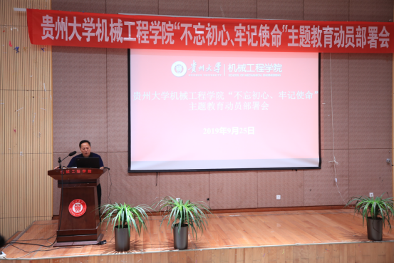 2019年9月25日,貴州大學(xué)機械工程學(xué)院黨委“不忘初心,牢記使命”主題教育部署會在機械樓圓形報告順利召開。校巡回指導(dǎo)小組四組組長許道云、成員李臣宇以及學(xué)院及現(xiàn)代制造重點實驗室在家處級領(lǐng)導(dǎo)干部、院黨委委員、各黨總支、黨支部委員、全體師生黨員參加了此次會議。會議由學(xué)院黨委院長李少波主持。