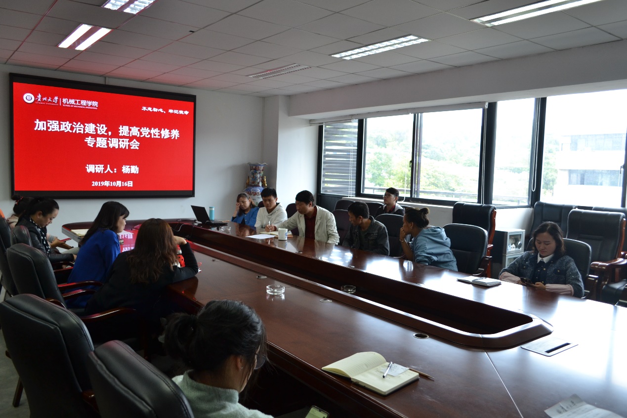 (記者 范順鑫|攝影 范順鑫 )為認真落實中央、省委和貴州大學(xué)黨委的決策部署,扎實開展學(xué)院“不忘初心、牢記使命”主題教育工作,根據(jù)機械工程學(xué)院黨委班子成員開展主題教育調(diào)研方案,10月16日,機械工程學(xué)院副院長楊勤在機械樓518會議室召開“加強政治建設(shè),提高黨性修養(yǎng)”專題調(diào)研會,學(xué)院黨委副書記代祥社及各支部書記、學(xué)生黨員代表、教職工黨員代表參加了會議。