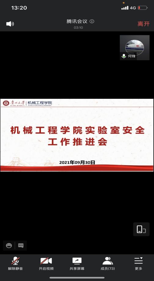 9月30日13:00,學(xué)院召開(kāi)實(shí)驗(yàn)室安全工作線上專題推進(jìn)會(huì),黨委書(shū)記安明剛、院長(zhǎng)李少波、副書(shū)記廖燁、副院長(zhǎng)楊勤、何鋒出席會(huì)議,學(xué)院教師參加會(huì)議,會(huì)議由安明剛主持。會(huì)上,何鋒強(qiáng)調(diào)安全是保障師生們生命以及日常學(xué)習(xí)的生活的重要前提,要進(jìn)一步提高對(duì)安全工作重要性的認(rèn)識(shí),全院上下要樹(shù)立整體安全觀,不斷加強(qiáng)安全宣傳教育,做到人人皆知;不斷加強(qiáng)安全制度建設(shè),規(guī)范全院師生的安全行為,做到人人皆行;不斷深入開(kāi)展工作,加強(qiáng)安全排查力度,對(duì)風(fēng)險(xiǎn)管控做到精準(zhǔn)識(shí)別。廖燁強(qiáng)調(diào)實(shí)驗(yàn)室安全無(wú)小事,一要提高政治站位,樹(shù)立安全穩(wěn)定是第一責(zé)任意識(shí);二要落實(shí)責(zé)任,開(kāi)展自查自排工作,消除安全隱患;三要完善制度,建立相關(guān)臺(tái)賬。李少波指出,學(xué)院要完善管理模式、提升服務(wù)能力,要層層簽訂安全責(zé)任書(shū),安全責(zé)任落實(shí)到人,開(kāi)展安全大檢查。最后,安明剛強(qiáng)調(diào)要重新審視學(xué)院安全工作,并對(duì)學(xué)院安全工作提出更高要求,一要摸清底數(shù),清楚樓層教室安排、物品存放以及物品性質(zhì),明確負(fù)責(zé)人;二要提升安全意識(shí)和責(zé)任意識(shí),導(dǎo)師以及實(shí)驗(yàn)室管理人員要加強(qiáng)對(duì)學(xué)生和實(shí)驗(yàn)室的管理;三是強(qiáng)調(diào)國(guó)慶學(xué)生安全以及疫情防控相關(guān)要求。會(huì)后,學(xué)員班子成員對(duì)學(xué)院學(xué)生工作室、實(shí)驗(yàn)室開(kāi)展安全大檢查。
