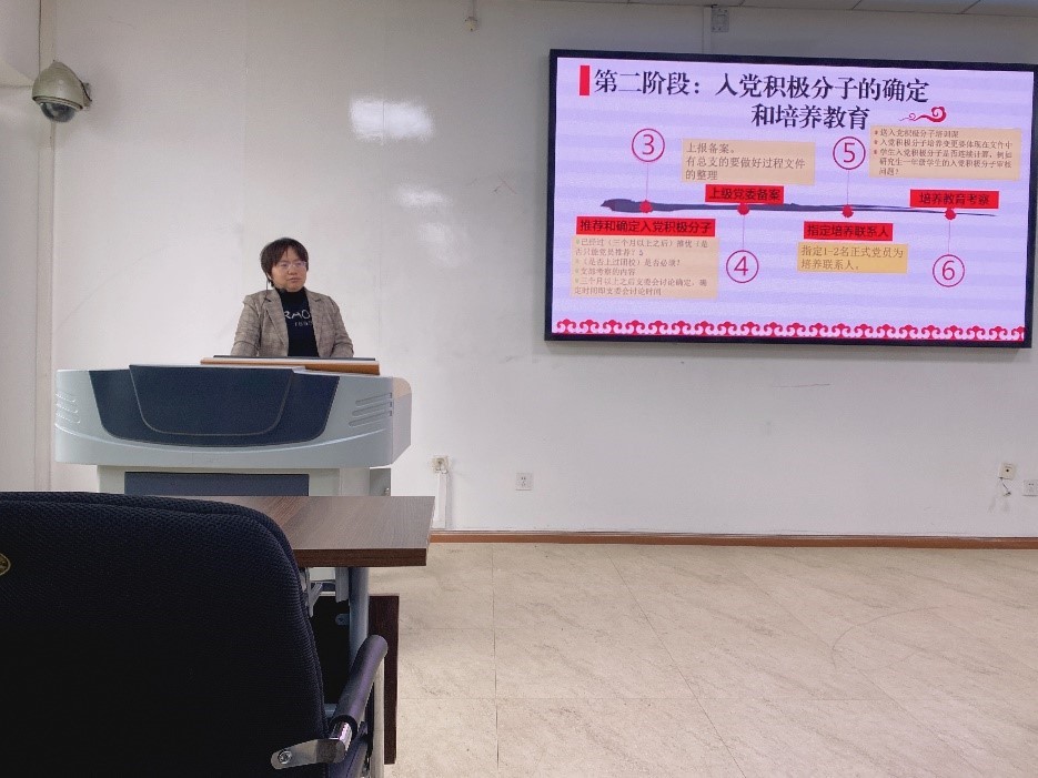 崔永霞結(jié)合《中國(guó)共產(chǎn)黨普通高級(jí)學(xué)校基層組織工作條例》《中國(guó)共產(chǎn)黨支部工作條例》兩個(gè)文件和自身豐富的黨務(wù)工作經(jīng)驗(yàn)對(duì)黨員發(fā)展過(guò)程中申請(qǐng)入黨、入黨積極分子的確定和培養(yǎng)教育、發(fā)展對(duì)象的確定和考察、預(yù)備黨員的接收、預(yù)備黨員的教育、考察和轉(zhuǎn)正五個(gè)階段進(jìn)行重點(diǎn)講解,并強(qiáng)調(diào)了每個(gè)階段的相關(guān)事項(xiàng)。并耐心細(xì)致的解答了老師及學(xué)生提出的相關(guān)問(wèn)題。