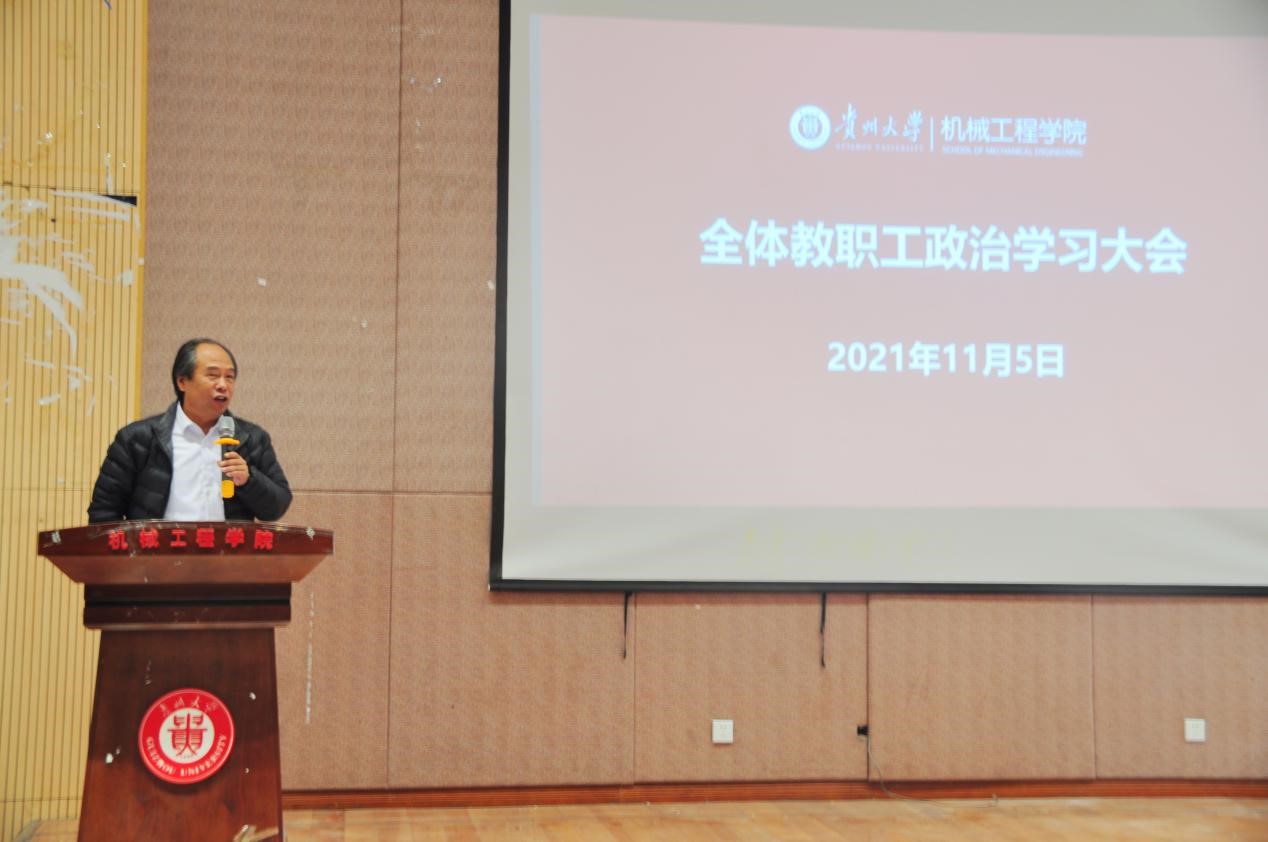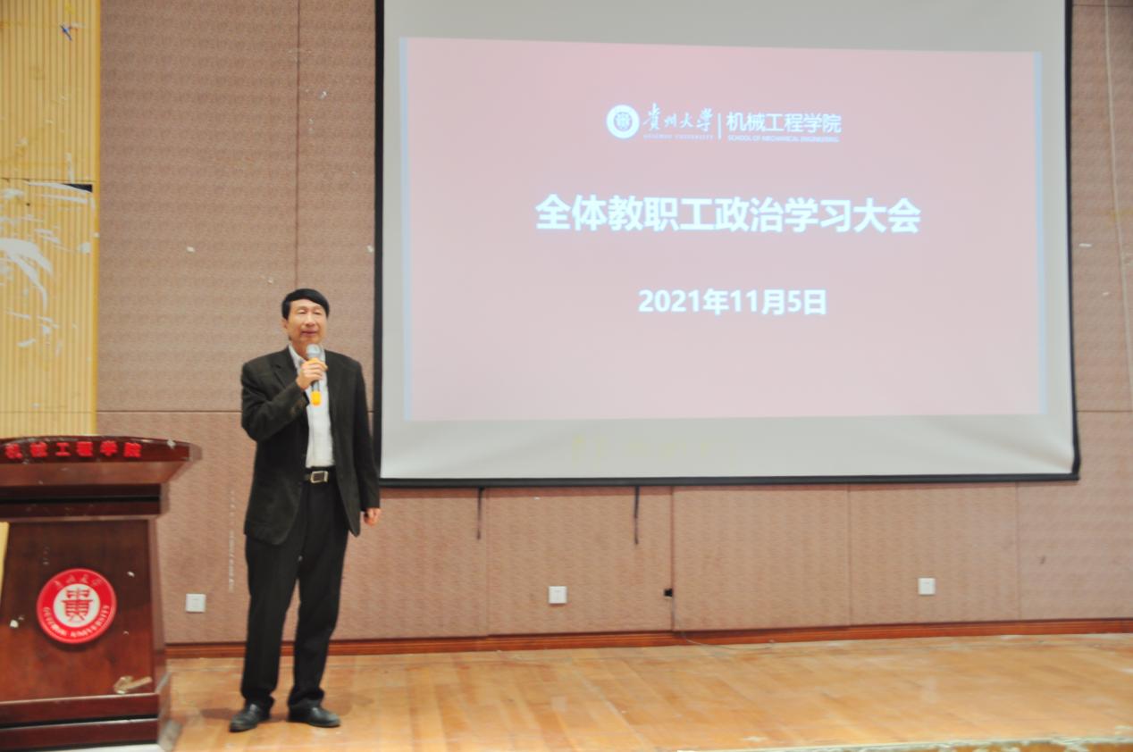 機械工程網(wǎng)站訊(記者 胡佳|攝影 胡佳)2021年11月 5日,機械工程學(xué)院于機械樓圓形報告廳召開教職工政治理論學(xué)習(xí)大會,學(xué)院黨委書記安明剛、副院長何鋒、楊勤出席會議,全院教職工參加會議。會議由安明剛主持。