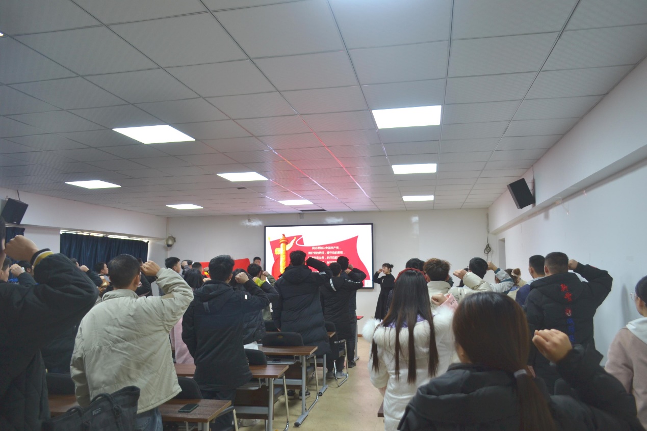 會(huì)議開(kāi)始,新發(fā)展的預(yù)備黨員在廖燁的帶領(lǐng)下,莊嚴(yán)地舉起右拳,面向黨旗鄭重宣誓。