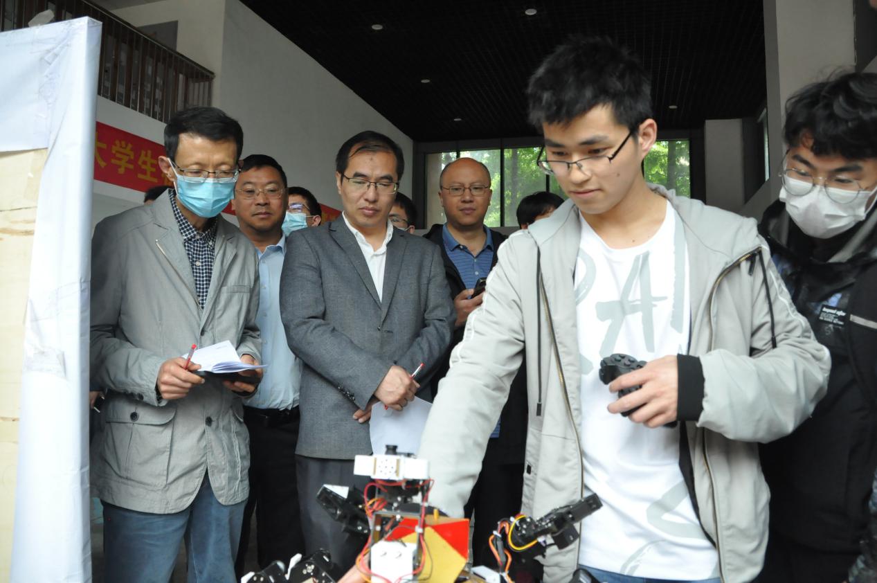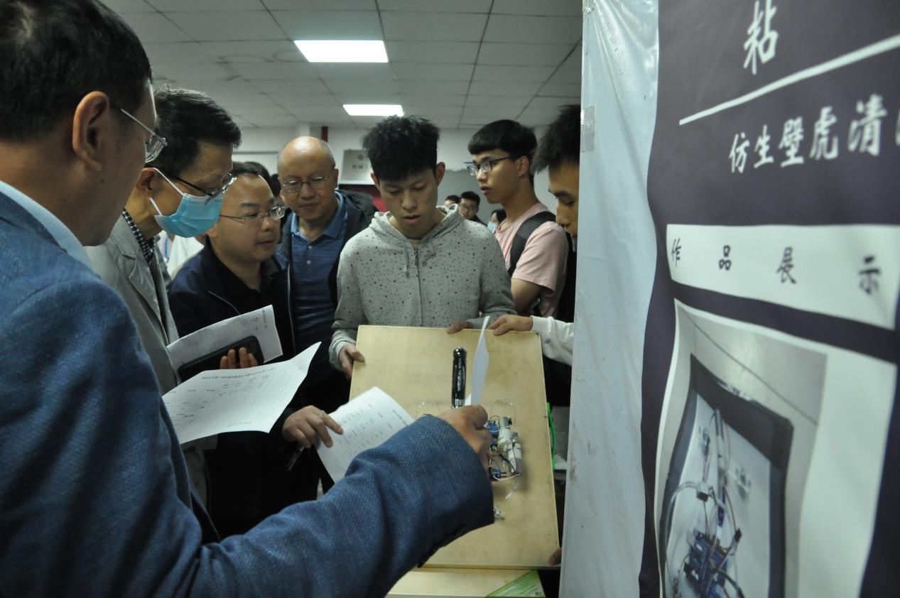 專家評(píng)審團(tuán)在機(jī)械工程學(xué)院一樓大廳依次查看各參賽隊(duì)伍的作品簡(jiǎn)介和實(shí)物演示,并進(jìn)行打分。隨后,專家評(píng)審團(tuán)進(jìn)行短暫地討論。所有參賽隊(duì)伍被分為兩組在機(jī)械樓416和518會(huì)議室進(jìn)行現(xiàn)場(chǎng)答辯。各組通過PPT展示作品的設(shè)計(jì)思路、設(shè)計(jì)方法、主要機(jī)構(gòu)設(shè)計(jì)等,評(píng)審團(tuán)專家根據(jù)各組現(xiàn)場(chǎng)演示的表現(xiàn)以及PPT展示提出問題,答辯選手進(jìn)行回答。評(píng)審團(tuán)的專家們對(duì)作品提出改進(jìn)意見和改進(jìn)方向。