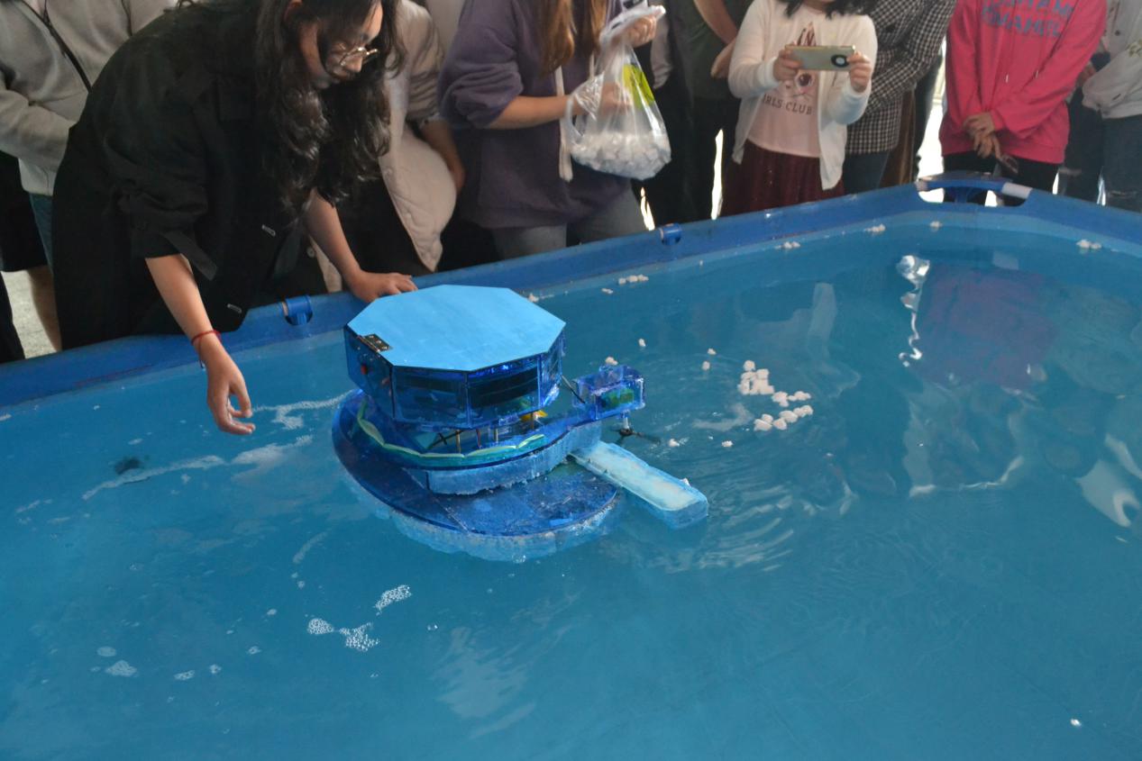 比賽現(xiàn)場(chǎng)人聲鼎沸,有活靈活現(xiàn)的仿生機(jī)械,也有生態(tài)修護(hù)、保護(hù)環(huán)境類的機(jī)械作品。參賽隊(duì)伍們各顯神通,向評(píng)審專家團(tuán)以及在場(chǎng)的老師同學(xué)們展示他們的設(shè)計(jì)成果?!疤窳?!”仿生機(jī)械“助力漁”一下水便引起了現(xiàn)場(chǎng)的驚嘆,他們的作品就像一條活生生的魚在水中游來游去。生態(tài)修復(fù)類別的垃圾處理機(jī)器人在水下順利完成垃圾抓取,得到了現(xiàn)場(chǎng)熱烈的掌聲。