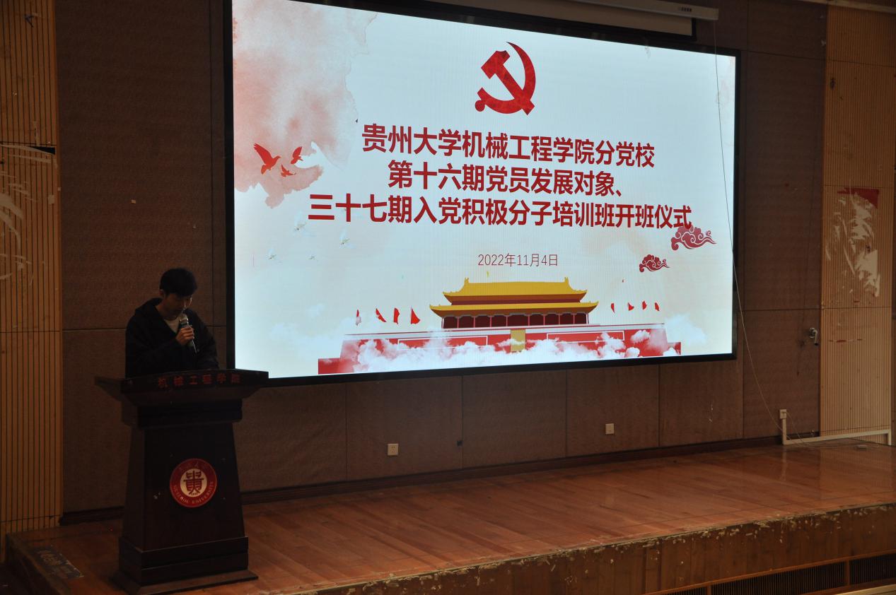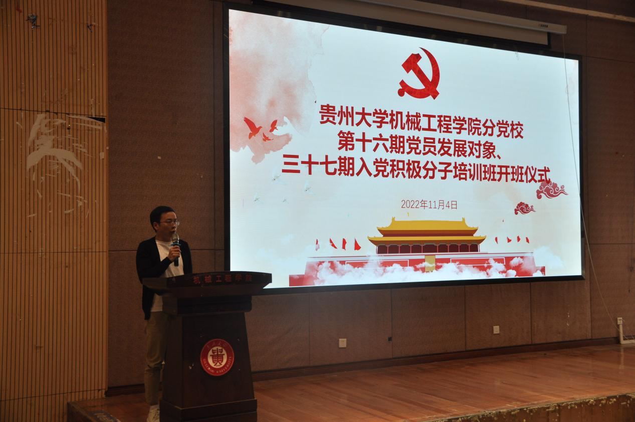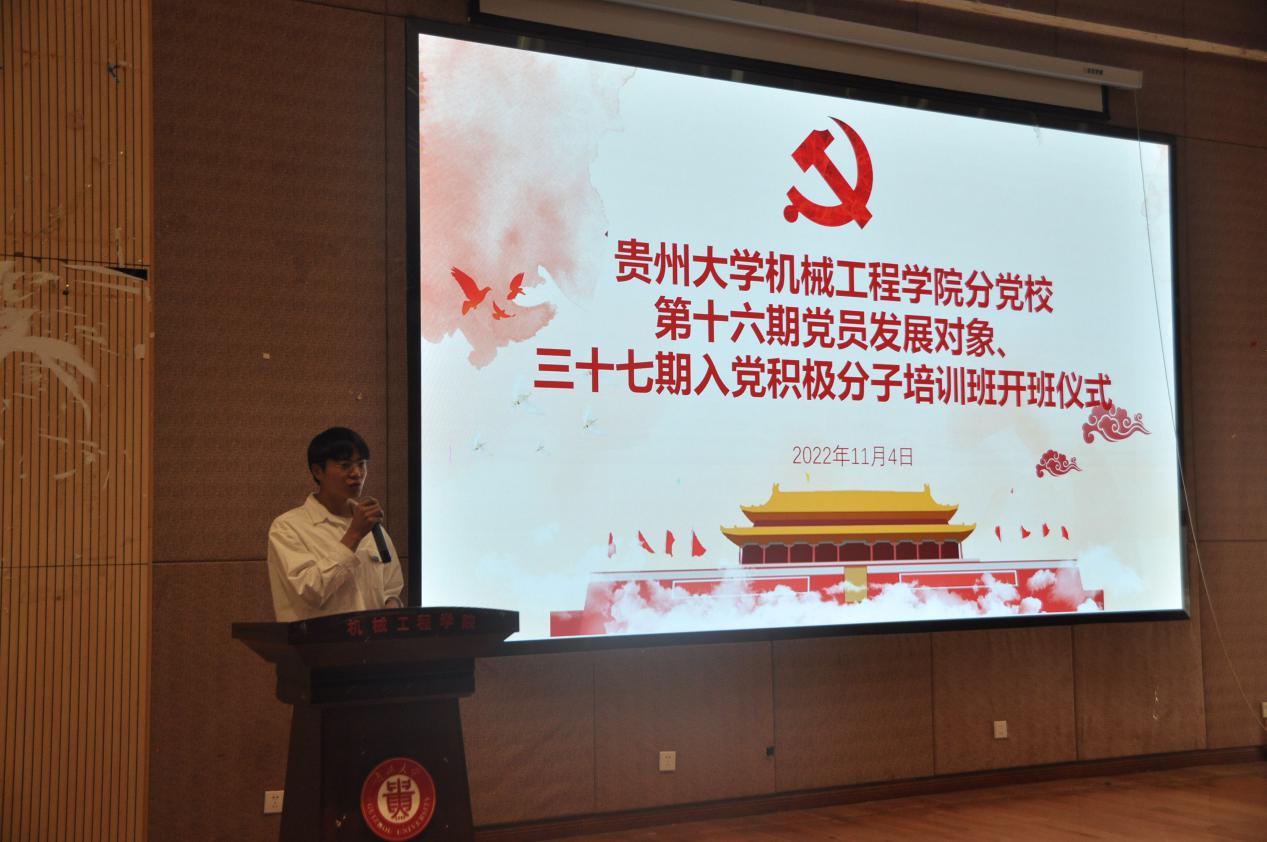 機械工程網(wǎng)站訊(記者朱漫華 |攝影 劉菲 路耀凌 )2022年11月4日,貴州大學機械工程學院分黨校在機械樓報告廳舉行了第十六期黨員發(fā)展對象、第三十七期入黨積極分子培訓班開班儀式,機械工程學院黨委書記滕召華、院長趙津、正處級組織員安明剛、黨委副書記廖燁出席會議,學生科輔導員何琳煜、王嘉斌及本期全體入黨積極分子和發(fā)展對象參加會議,會議由學生科輔導員趙麗芳主持。