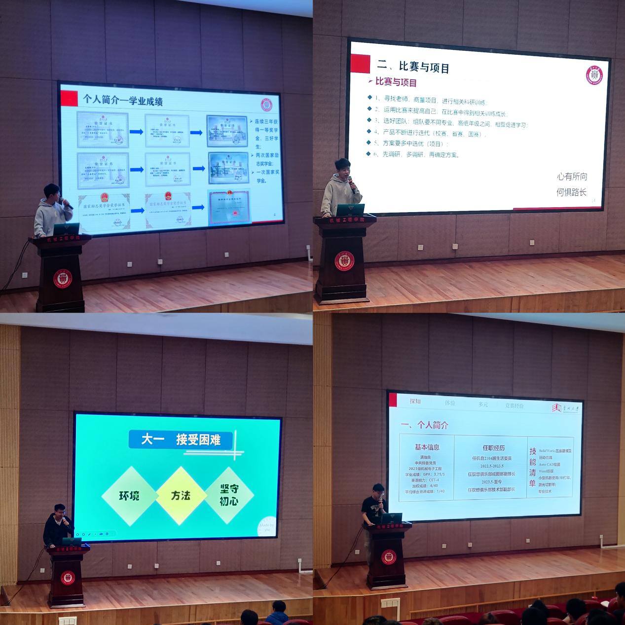 機械工程網(wǎng)站訊(記者楊朵|攝影凌海蕎)對話國獎,見賢思齊,自古成功無捷徑、千錘百煉才成鋼。為彰顯國獎、國勵獲得者的榜樣力量,強化學風建設,引導同學們學生勤奮學習、勵志成才,2024418日,機械工程學院舉辦“一站式”學生社區(qū)活動之“對話國獎 勵志篤行”分享交流會。會上邀請4名國家獎學金獲得者、2名國家勵志獎學金獲得者向360余名同學分享奮斗歷程和經(jīng)驗感悟,活動由學生科輔導員楊朵主持,正處級組織員董蔚然參加。