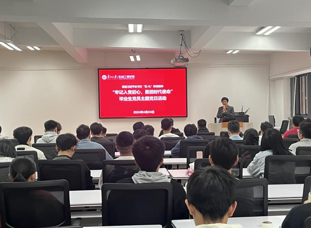 根據(jù)學(xué)院黨委統(tǒng)一安排部署,2024424日學(xué)院研究生科組織即將畢業(yè)研究生黨員開展“重溫習(xí)近平總書記‘五·九’講話精神,牢記入黨初心,勇?lián)鷷r代使命”主題黨日活動,畢業(yè)研究生黨員中深入開展“畢業(yè)前最后一堂黨課”活動。學(xué)院正處級組織員董蔚然、研究生黨建負責人田森老師、研究生兼職輔導(dǎo)員肖祥美老師、機械工程學(xué)院和現(xiàn)代制造技術(shù)教育部重點實驗室2024屆全體畢業(yè)研究生黨員參加活動。