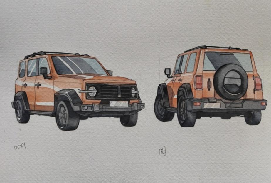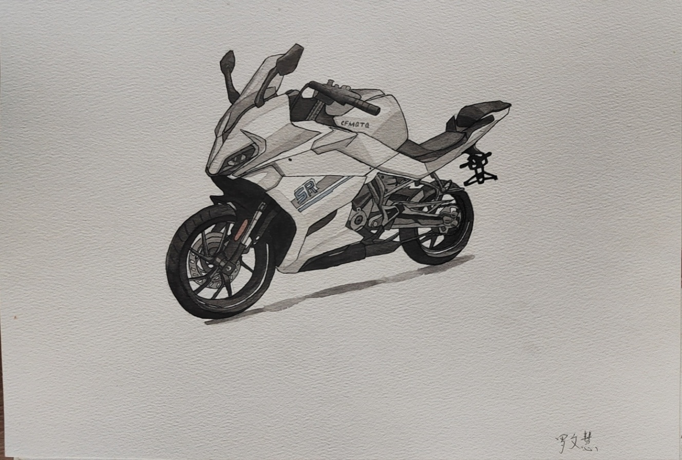 這幅水彩手繪摩托車畫作,巧妙地融合了水彩的輕盈與摩托車的力量感。畫中是一輛獨(dú)具特色的摩托車,其流暢的線條和鮮明的色彩使得整個畫面充滿動感,其金屬質(zhì)感通過水彩的透明度和層次感得到了較好的表現(xiàn)。