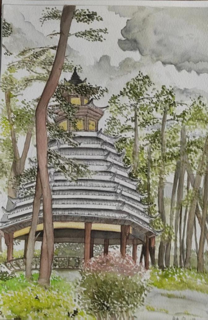 這幅作品取地貴州大學(xué)育賢廣場寫生,畫面中心是位于廣場中心的侗寨鼓樓。其獨(dú)特風(fēng)格體現(xiàn)了中國傳統(tǒng)建筑的魅力。周圍環(huán)繞著郁郁蔥蔥的綠色植被和樹木,為整個場景增添了生機(jī)與活力。天空中密布的云為畫面增添了一種神秘而寧靜的氛圍,與地面的建筑和植被形成鮮明對比,進(jìn)一步凸顯了自然與人文的和諧共存。整個畫面色彩柔和,構(gòu)圖和諧,展現(xiàn)了一種平和與自然之美的感覺。