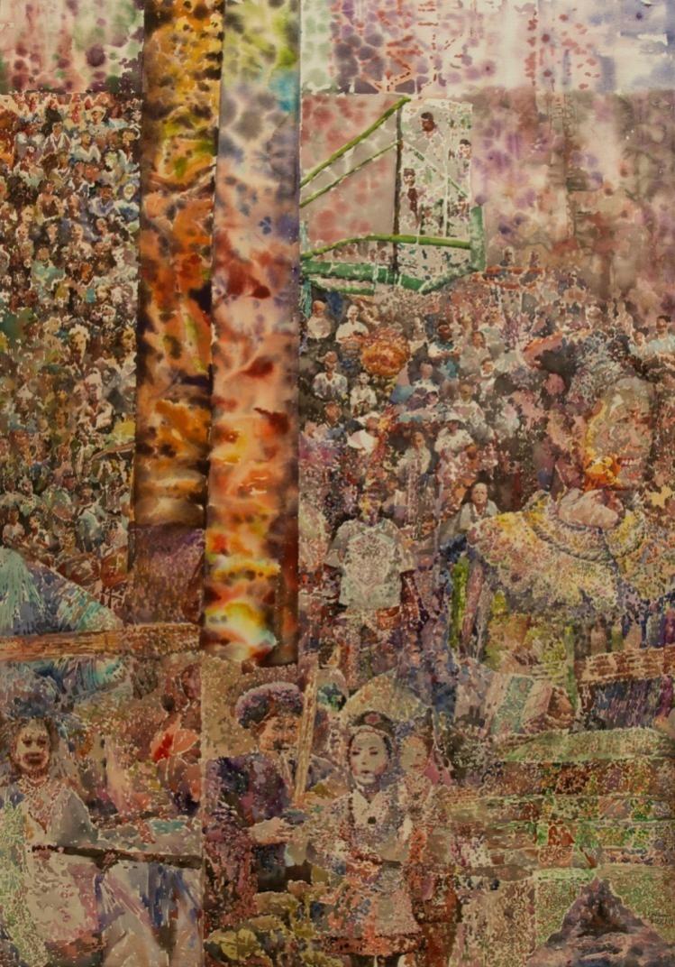 2022年,貴州省黔東南州臺盤鄉(xiāng)臺盤村舉辦貴州省“美麗鄉(xiāng)村”籃球聯(lián)賽?;鸨W(wǎng),被稱之為“村BA”?!按?/span>BA”由“六月六”吃新節(jié)籃球賽演變而來,已有百年歷史。畫面上方描繪了密密麻麻的觀眾,左中下方為幾個表演反排木鼓舞的村民,中間為一個籃球架和打籃球的選手,右方是一個微笑著表演侗家琵琶音的姑娘。畫面用斑斕的色彩表現(xiàn)了多彩貴州豐富燦爛的民族文化,也表達(dá)了作者希望傳統(tǒng)民族文化在新時代煥發(fā)出新的生機(jī)活力,綻放出更加迷人的光彩的愿望。