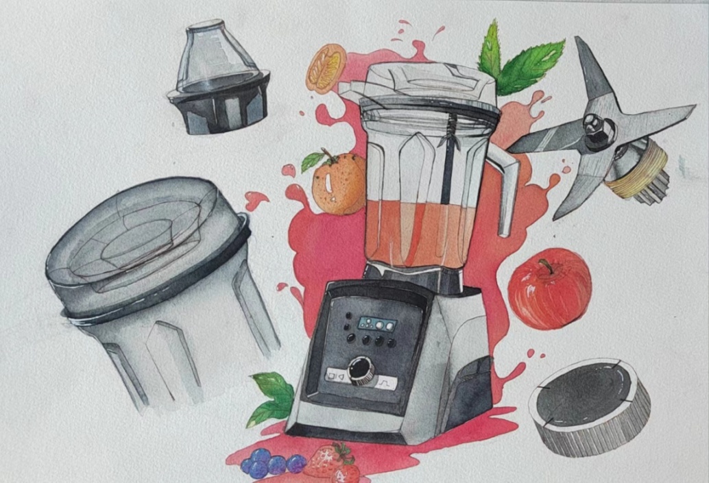 這張圖片展示了一臺水彩畫風(fēng)格的榨汁機(jī)。主體色調(diào)通透,給人一種清新自然而又現(xiàn)代的感覺。內(nèi)部放著顏色鮮艷的小番茄,增添了畫面的色彩對比,使畫面充滿生機(jī)和活力。