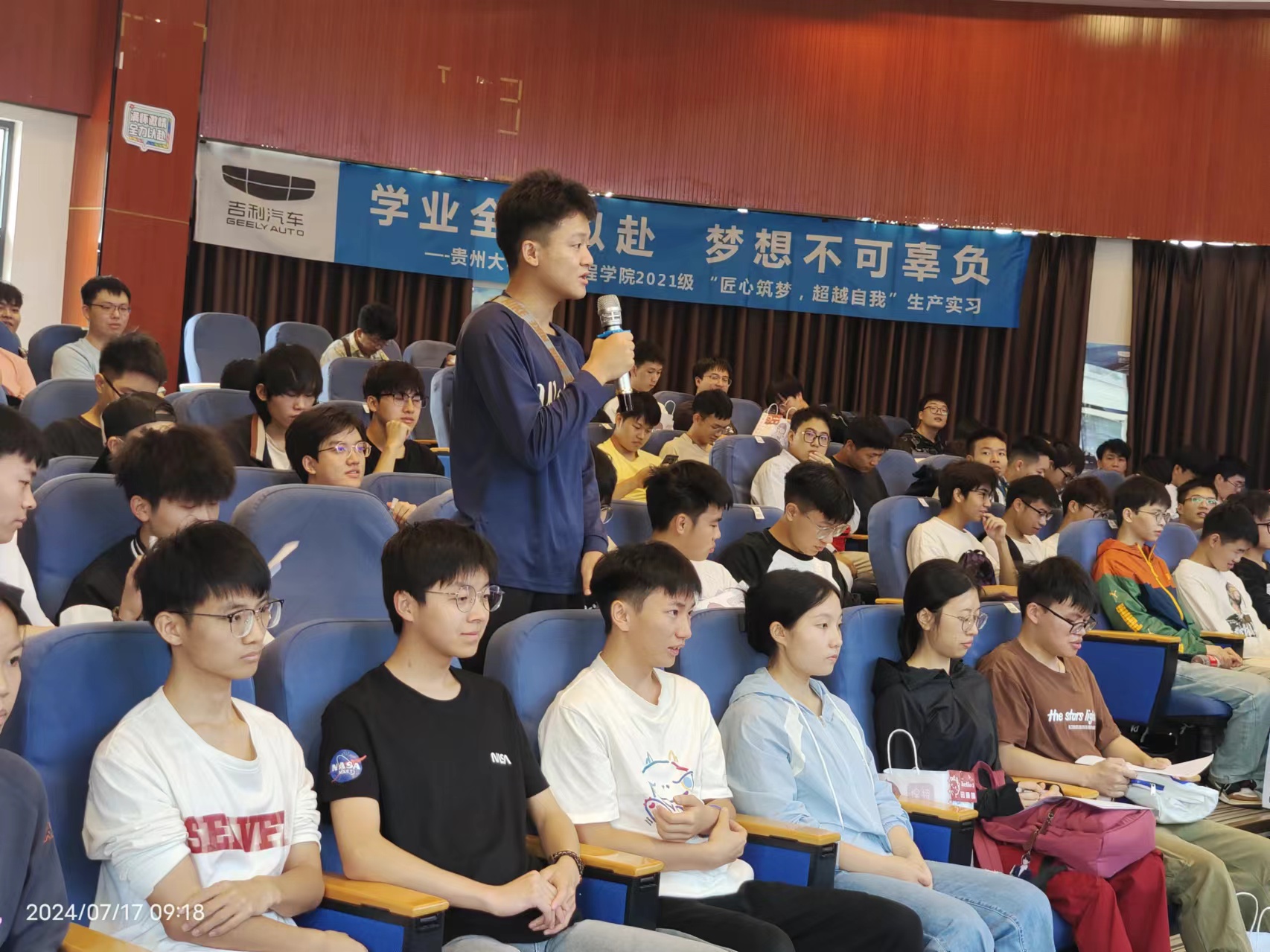 最后,吉利人力資源主管周全輝作了發(fā)言,他介紹了貴陽吉利汽車的發(fā)展歷程,并以學(xué)長的身份和同學(xué)們分享了他的工作經(jīng)歷和經(jīng)驗(yàn),最后,他表示,希望今年在吉利生產(chǎn)實(shí)習(xí)的同學(xué)明年畢業(yè)加入吉利工作。