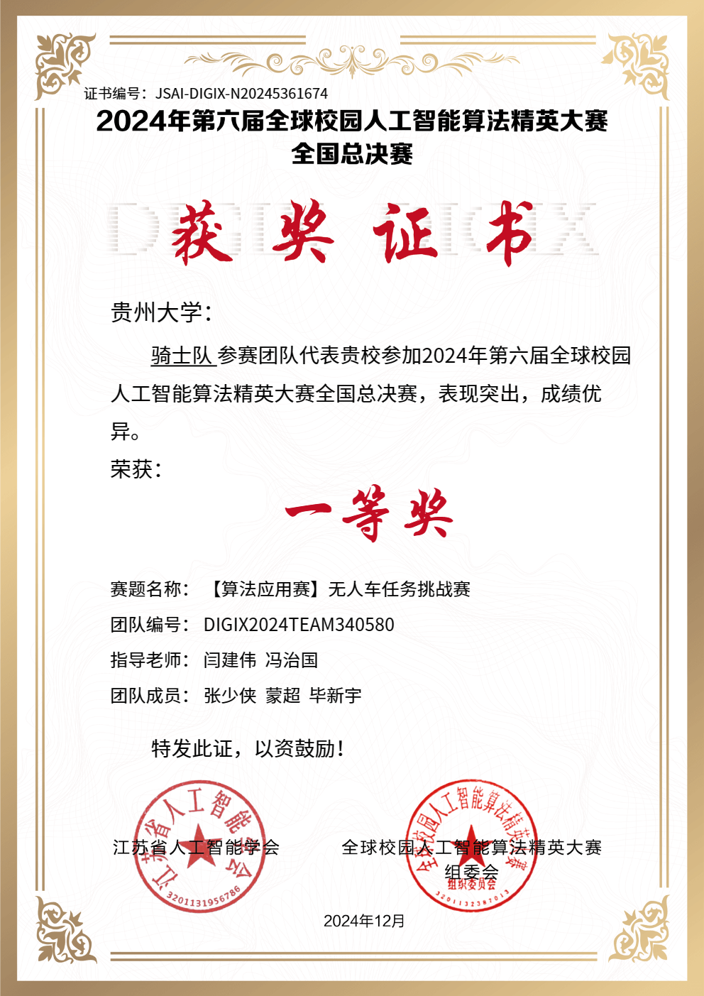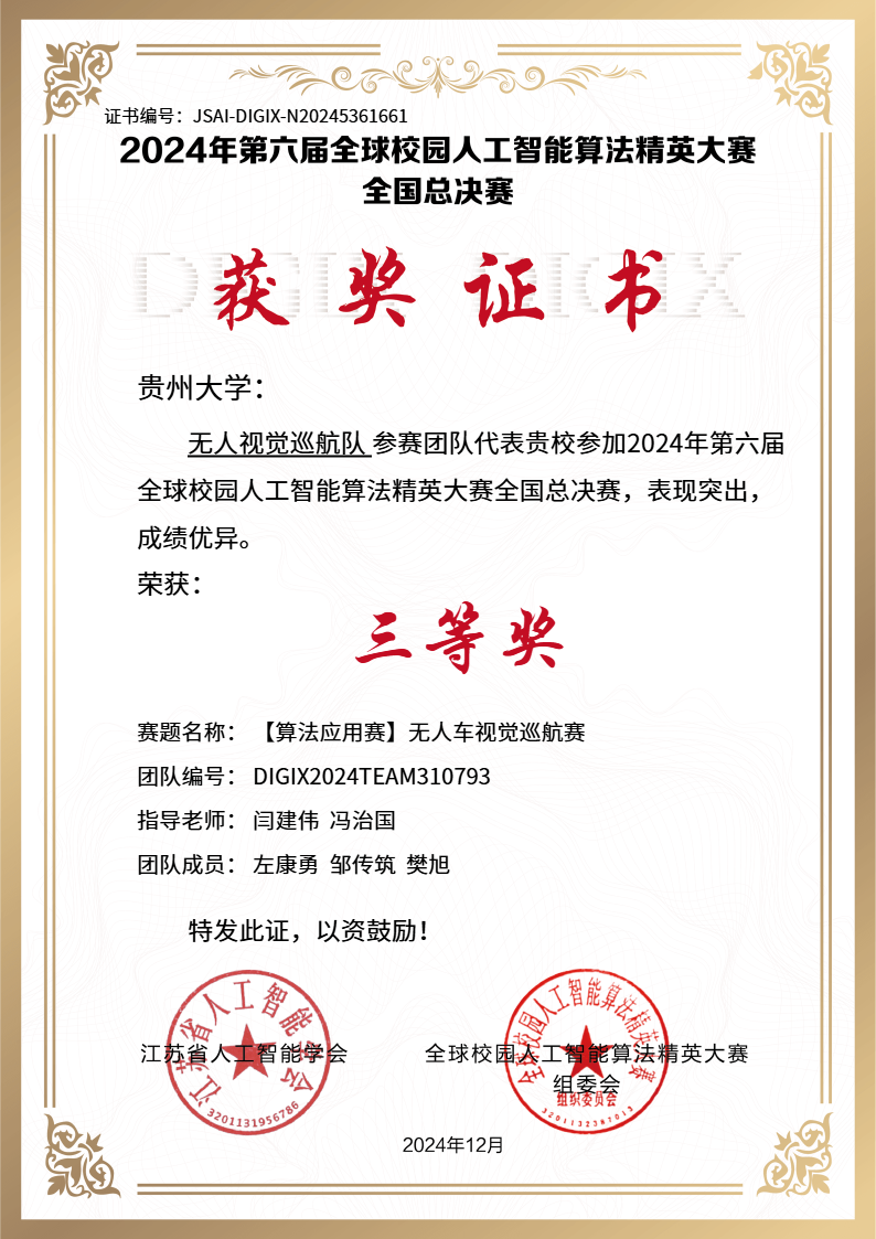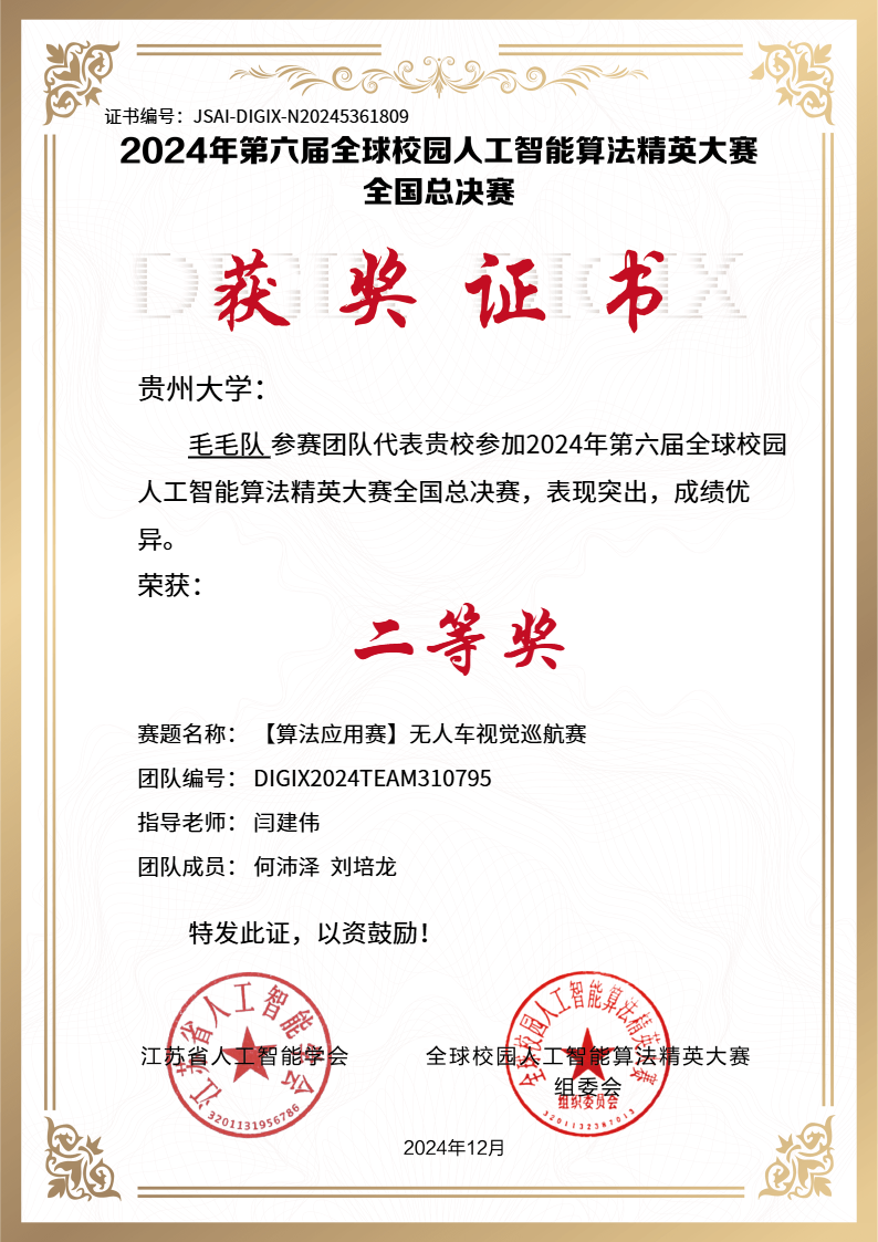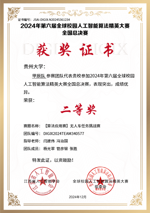 此次全國總決賽貴州大學(xué)派出由機(jī)械工程學(xué)院閆建偉、馮治國等老師指導(dǎo)的9支隊(duì)伍參加算法應(yīng)用賽無人車任務(wù)挑戰(zhàn)賽、算法應(yīng)用賽無人車視覺巡航賽、算法創(chuàng)新賽人工智能+新農(nóng)科等賽項(xiàng),經(jīng)過激烈角逐,共斬獲了2項(xiàng)國賽一等獎、3項(xiàng)國賽二等獎、1項(xiàng)國賽三等獎,這是繼參加第二十六屆中國機(jī)器人及人工智能大賽后再次獲得國賽一等獎2項(xiàng),再次創(chuàng)造了貴州大學(xué)參加該比賽的歷史最好成績。